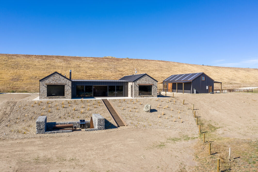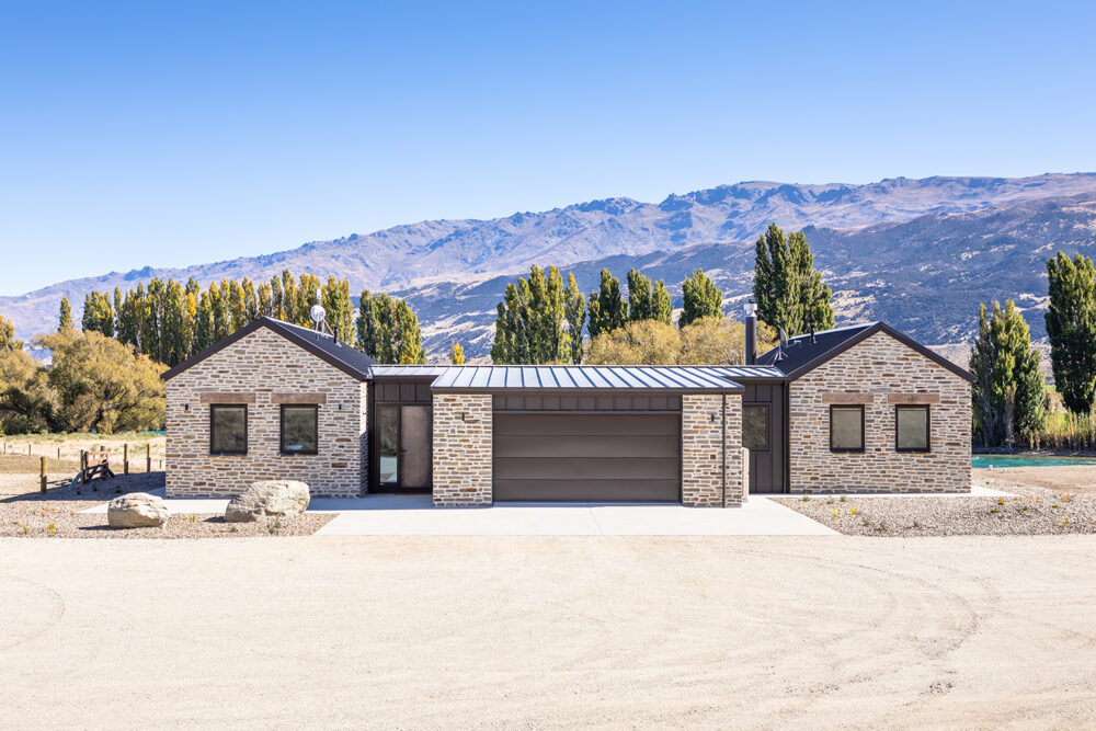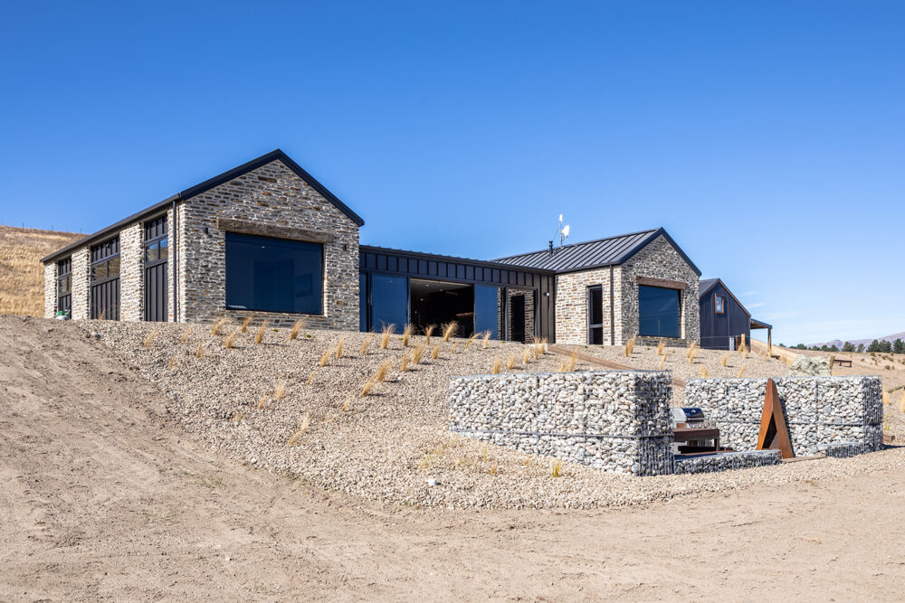Their new home is built using Cluden Quarry schist mixed with Hyde stone, and what catches the eye are the recycled Australian Hardwood lintels. – sourced locally from Ironwood Recycled Timbers in Earnscleugh. The old hardwood beams were once used on a bridge on the South Island’s West Coast – and now given new life on their rural property off Maori Point Road.