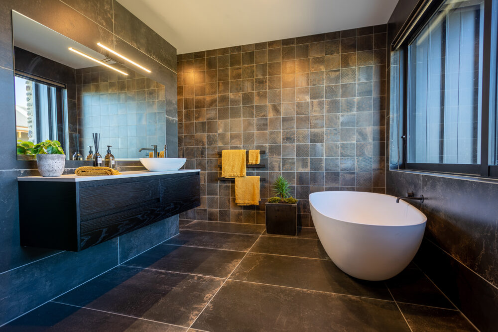 Vintage French Oak flooring throughout the lounge and dining area lead in two directions towards near matching bathrooms, except for their tiles that demand attention. Scott has a business background in ceramics so there is no scrimping on quality, with a mixture of smaller 20x20cm porcelain tiles matched to accent the main 120x60cm ones.