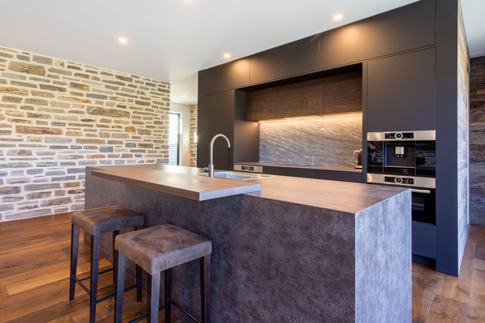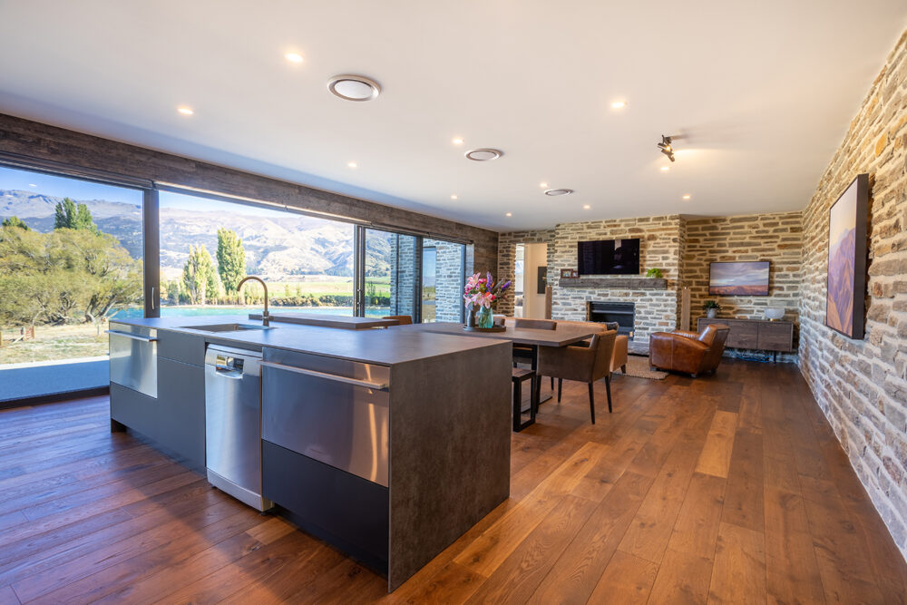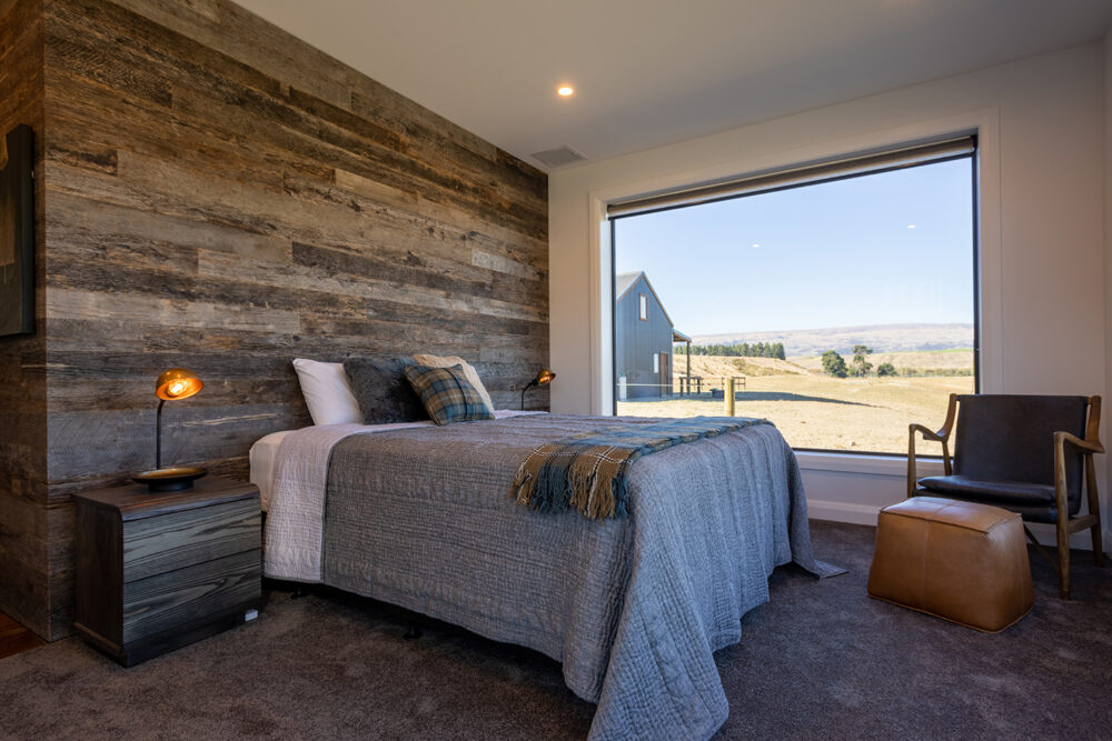 It’s another world inside Sue and Scott’s* new Breen home at Tarras – influenced by an old gold miner’s cottage, but on a much larger scale. There are surprises around every corner, including the large internal schist stone wall and the hidden linen cupboard, cleverly disguised by American Ash wall panelling.
